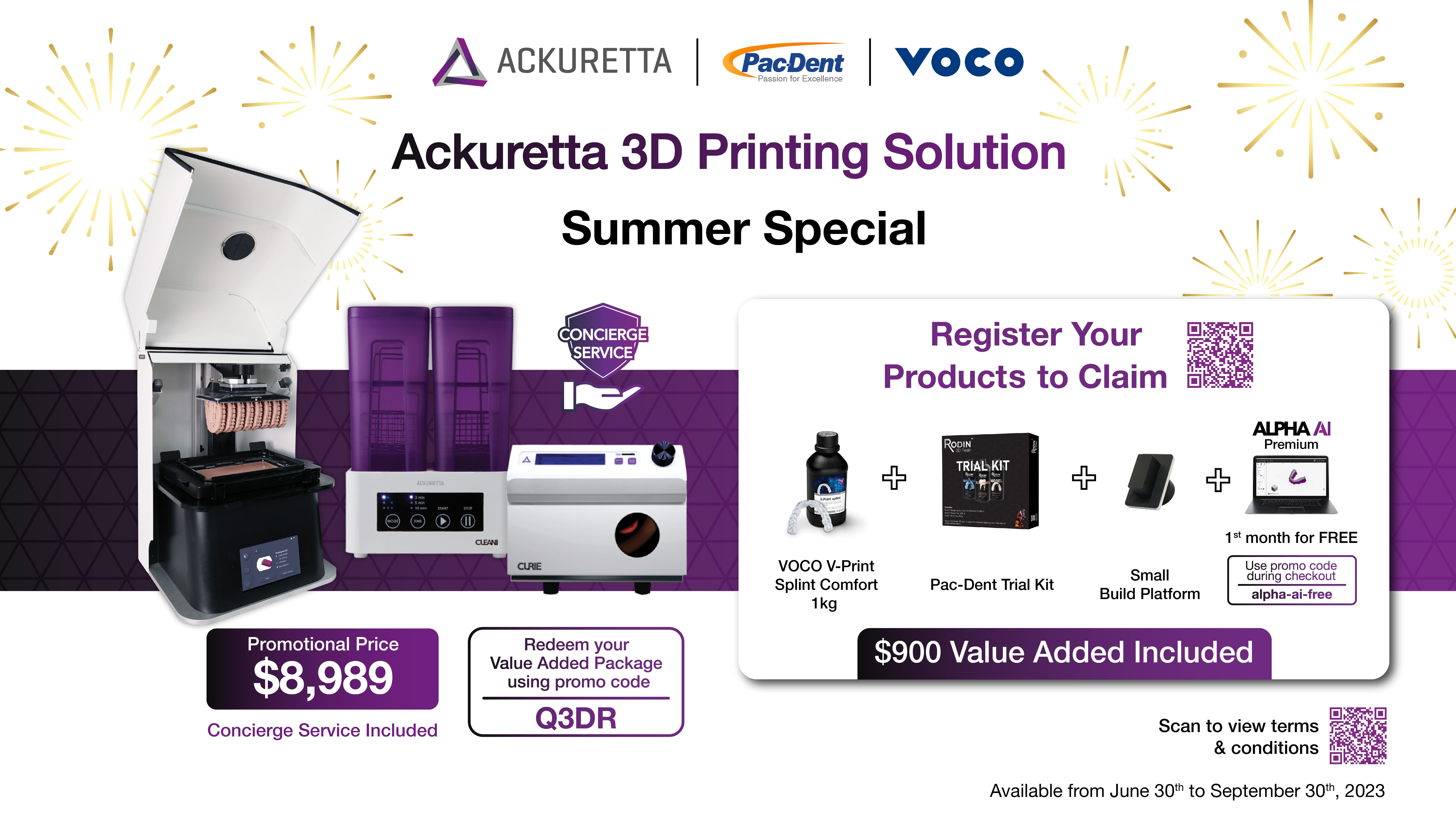 Customers paying the promotional price of $8,989 qualify to receive up to $900 of free goods including the Pac-Dent Trial Kit, 1 kg VOCO V-Print Splint Comfort, the Ackuretta Small Build Platform, and 1 month free for ALPHA AI Premium.